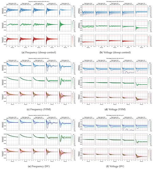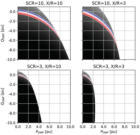 The plots show that, for achieving compliant voltage levels, reactive power compensation is crucial for weak grids with low SCRs. However, if the ratio is also low, reactive power compensation loses its effect. This is explained by the increasing impact of coupling effects between resistance and reactance with respect to active power and reactive power (see []). This corresponds to the findings from Figure 4.