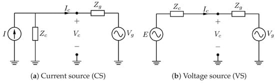 A well-established formulation of the concept of GFM converters is still under discussion []. However, a key difference between a GFL and a GFM converter is that they behave as a current source (CS) and a voltage source (VS), respectively. Even though both are voltage source inverters, they emulate this behavior with the control. Consider these converter topologies connected to the grid, as shown in Figure 7.