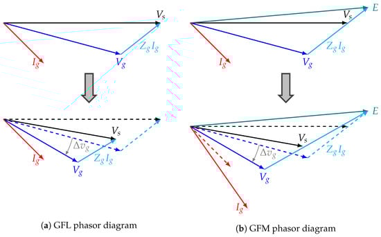 Phasor relations of GFM and GFL converters due to grid voltage perturbations.