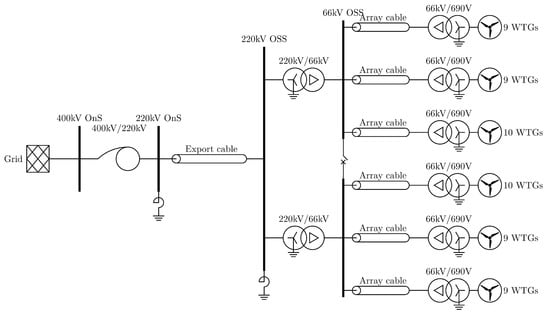 A generic OWF design with 8 MW WTs are introduced of one cluster with six strings in the collector system as shown in Figure 9. Balanced RMS-simulations are performed to study frequency and voltage responses from a frequency disturbance from a power imbalance in the grid scaled to 5% of the installed OWF capacity. The grid voltage is modelled as a synchronous generator (SG) [].