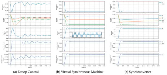 The VSM and SV had a frequency disturbance response that would have been typical for a synchronous generator. This proved that the implementation and setup were correct. It was noticed that the voltage angle of the VSM suffered from an unstable limit cycle (as seen in Figure 11b). This was caused by various limiters in the control systems []. Furthermore, in [], numerical issues with the VSM were also addressed. The responses of the VSM and SV looked very much alike, but the SV managed to restore the voltage because of the coupling between the inertial emulation and the voltage regulation via the Zhong equations, as seen in Figure 11c.