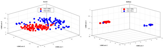 The visualization of the extracted features from the second layer of convolution, and the softmax layer for the testing data, using the t-SNE method.