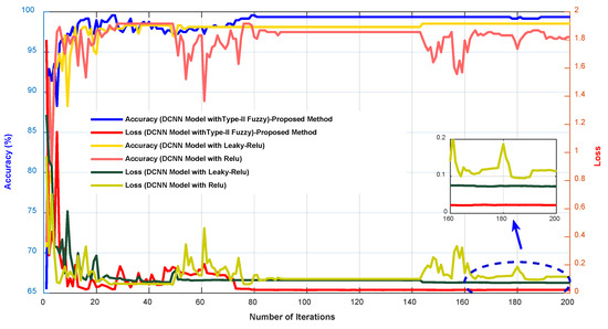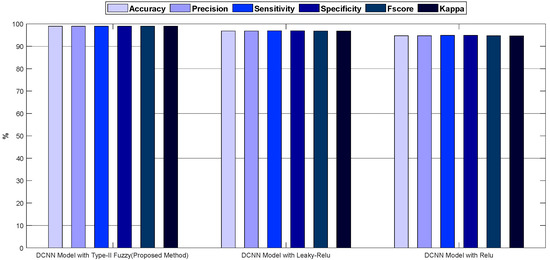 In Figure 7, the accuracy and error diagrams of the proposed method based on the DCNN model with type-II fuzzy activation function (for validation data and different iterations) are compared with the DCNN model with Relu and Leaky-Relu activation functions, in order to demonstrate its desired performance. Figure 8 also depicts bar chart diagrams of accuracy, precision, sensitivity, specificity, kappa, and f-score for the proposed method, compared to the DCNN model with Relu and Leaky-Relu activation functions.