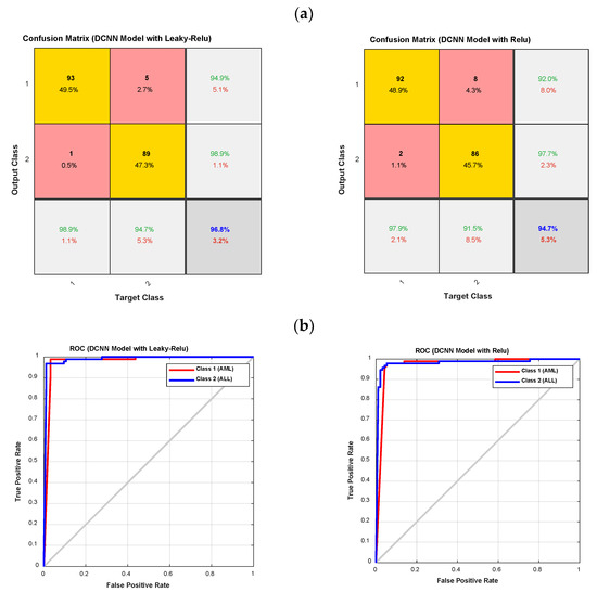The confusion matrixes and ROC diagrams for the DCNN model with Relu and Leaky-Relu activation functions; (a) the confusion matrixes; and (b) the ROC diagrams.