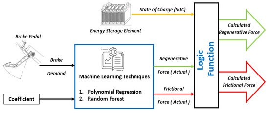 A vehicle braking system is now incorporated with artificial intelligence to measure the intensity of the braking required based on real-time scenarios [11,12]. With the leap to digital transformation, machine learning and artificial intelligence has been an interdisciplinary area applied to various domains, including electric vehicles [13,14]. The main focus is regenerative braking during deceleration, especially at traffic signals or turnings. A special algorithm for regenerative braking has been designed that optimizes the power harnessing during decelerations at the traffic signals [15,16]. When it is impossible to represent the system explicitly and accurately, machine learning paves its path to understanding the data and making appropriate best decisions accordingly. A nested learning framework has been developed to manage the energy in an HEV and minimizes the cost of power sources using machine learning techniques [17,18]. Deep learning networks are now used to estimate the SOC of the lithium-ion batteries that can self-learn the behavior in real-time and change their activation functions to provide the best-optimized method for SOC calculation [19]. The use of regenerative braking is not limited to electric vehicles or four-wheelers but has moved to every segment of vehicles that can be powered by batteries [20].