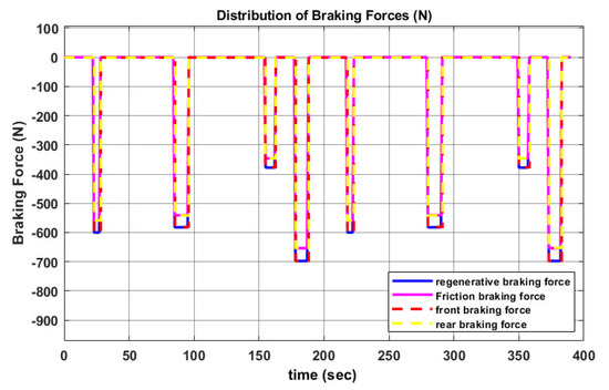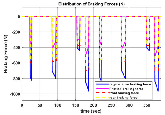 From Figure 10, it can be observed that the regenerative braking force was equal to the total front braking force. The regenerative braking force during the time interval of 150–200 s is observed in Figure 4, where the force was around −1000 N, whereas in Figure 10, the force was around −700 N. From this analysis, polynomial regression produced better results in maximizing the regenerative braking force than compared to that of random forest regression. The corresponding regenerative powers are plotted in Figure 11. As a result of the force not being maximized, there was low power harnessed by the regenerative braking with the random forest regression methodology.