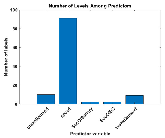 The power harvested for the cycle using polynomial regression is shown in Figure 5. The fact that the power is negative means that the voltage at the DC-Link will also be negative, making it possible to recover the energy and store it in a battery or supercapacitor. The motor power is proportional to the car’s speed and the driver’s brake demand. The same analysis has been performed using an ensemble method, bootstrap aggregation, like the random forest, to evaluate its efficiency. With ensemble methods, a lot of other analysis has been carried out to reduce its computation time. Initially, all the descriptors/parameters were classified and plotted to know their homogeneity. From Figure 6, the number of levels for the state of charge of the battery and supercapacitor are the same. The highest number of levels can be seen for the speed variable, considering it is non-categorical. Therefore, homogeneity is not maintained. So, to understand the predictor’s importance, the standard CART algorithm was not used. Instead, the curvature test or interaction test was used for the accurate predictor importance estimates.