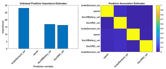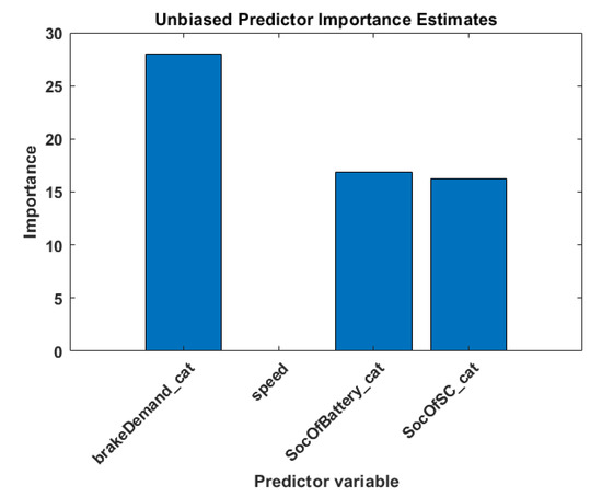With the curvature test, the predictor importance estimate was calculated and is shown in Figure 7. It can be seen that the result is highly dependent on the brake demand of the vehicle, i.e., the force driver applied to the brake. There is void importance for the speed variable. Following the brake demand, the next priority was equally shared by the SOC of the battery and supercapacitor.