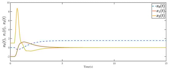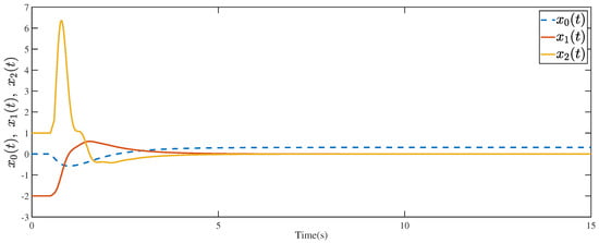 In the simulation, we firstly consider the case where the time delays are and ; the bias fault is ; and the parameters are . Therefore, the Hurwitz polynomial coefficients are chosen as and [35], and the control gain is chosen as . Figure 1 and Figure 2 show the effectiveness of the integral controller (28) when the initial state for . It can be clearly observed from Figure 1 and Figure 2 that the states and are bounded and asymptotically convergent to zero, the integral state is bounded and asymptotically convergent to , and the state of controller (28) is bounded and asymptotically convergent to . Similar results can also be obtained from Figure 3 and Figure 4, where the parameters , , and are reselected as , , and with the same values of other parameters.