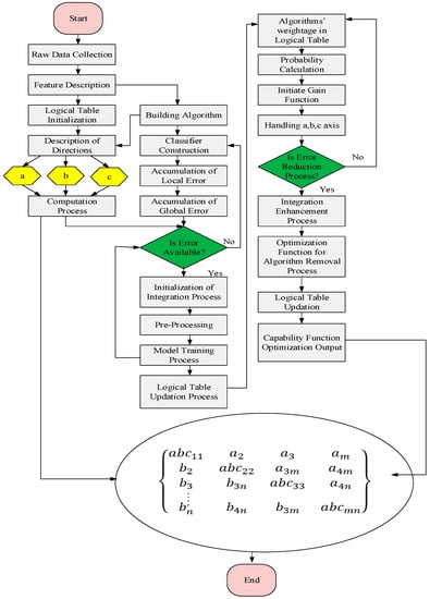 Step 14 provides the distance function’s correct arguments. Steps 15–16 show the activation processes of Turing and blended functions, which provide the alert on the logical table. If an error is discovered, the error classifier functions of are invoked and the best set of features is determined in steps 17 through 19. The alert is set on the logical table to identify errors in tuples and blocks in step 20. Additionally, steps 21–22 establish the ideal fitness range. The suggested PTIP has an updated logical table. Step 23 involves setting the strategy function for each dimension. The classifier sets and triggers the cost function for error and data validation. If a value of error < 0.5 is found inaccuracy removal is commenced, and the logical table is eventually modified in steps 24–30.