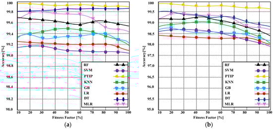 We ran 10 experiments (using 200 data samples) for various datasets to observe the overall performance of the algorithms: Support vector machine (SVMs), K-Nearest Neighbor (KNN), Logistic Regression, Multiple Linear Regression (MLR) [29], Decision tree (DR) [30], Graph-based boosting (GB) [31], and Random forest (RF) algorithm [32]. The PTIP is implemented and compared with existing techniques. The results are produced as depicted in Figure 10a. We used CART and ID3 for DT, and it has been observed that the proposed PTIP is found to be efficient. When the number of data samples is increased to more than 300+, the performance of the proposed PTIP still remains stable as compared to competing algorithms depicted in Figure 10b. On the other hand, the accuracy of the contending algorithms is greatly affected. It is imperative to note that we observed through our experiments that the outcome of various algorithms is not highly consistent. Hence, it is our motivation to pursue this research to stabilize the outcome and create a modified version that may be generalizable for many different problems and datasets.