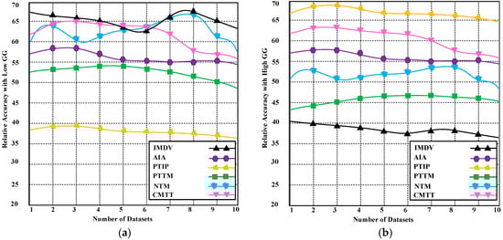 The lower relative accuracy with low GG is considered good. The PTIP obtains 38.76% relative accuracy with error bounds reflection. While the contending methods produce 48.7–61.2% relative accuracy with error bounds reflection, that is considered worse. Figure 11b demonstrates the relative accuracy with a high GG. Based on the result, it is observed that PTIP produces better relative accuracy that helps improve the classifier. The main reason for getting better relative accuracy with high GG is to use of improved optimum fitness function. The PTIP obtains 70.5% relative accuracy with high GG, which is considered an acceptable accuracy. On the other hand, the contending methods gain low relative accuracy with high GG which is considered worse. The contending methods obtain 42.4–55.3% relative accuracy with high GG. The findings were derived from 10 separate datasets using an experiment with an average of 20 runs.