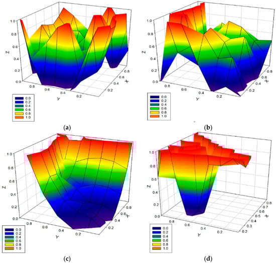 The PTIP is capable of reducing errors. The error reduction method is depicted in Figure 13a–d. Figure 13a depicts the gain function dispersed across ten experimental runs. This result shows that the blended function in PTIP is distributed randomly along all axes. It demonstrates that GG is exceedingly low, and the model’s fitness is quite bad. Figure 13b depicts the progress of the PTIP as the number of errors decreases. Figure 13c depicts the tuning process’s evolution. As can be observed, the x and y dimensions have faded, and z has outrun the fitness limitations. However, the yellow color in the z-axis indicates an inaccuracy of more than 80%, which is still unacceptable for model application. Figure 13d finally shows the error in bounds of the (20–80%) rule, and the z-dimension has finally been optimized. The values displayed for 1.0 are optimistic, and the realistic values are observed from ranging 0.6–0.85.