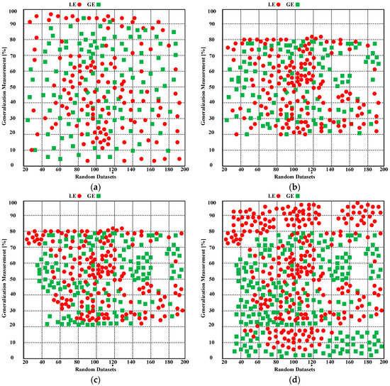 The generalization measurement process is depicted in Figure 14a–d. The experiment for 200 random datasets has been demonstrated using the proposed PTIP for generalization improvement. The proposed PTIP’s GE and LE functions are depicted. A circle represents the GE function, whereas a square represents the LE function. It should be highlighted that these findings come after measuring the model’s accuracy as an ideal fit across many thousand iterations.