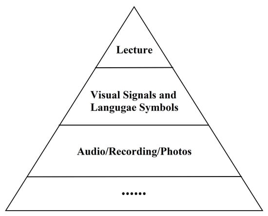 As is indicated in [], sound may have a greater influence on immersion than immersion has on images. Sound is one of the most important sources of human cognition. VR/AR content matching of audio effects has a great impact on enhancing users’ memory of content. Dale, an American audiovisual educator, put forward the theory of a “tower of experience” in his book Audio-Visual Methods in Teaching. This theory considers how human experience is derived. Figure 2 shows the top three layers in Dale’s tower of experience (the main theoretical basis of audiovisual education). The third row from the top represents audio/recording/photos, and the layer above is visual signals and language symbols, indicating that the combination of listening and audition is more conducive to memory and understanding of knowledge.