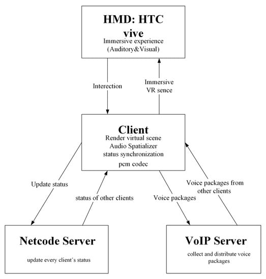 - Client: The client, usually a high-performance computer, is responsible for collecting the microphone input from the HMD, obtaining the pulse code modulation (PCM), compressing the PCM packets, and sending it to the VoIP server. Meanwhile, it receives the PCM packets from other clients sent by the server, decompresses them, and processes them with the spatial audio algorithm [] to play the audio with room reverberation and orientation. The client synchronizes the position to the Netcode server and updates the position of other clients obtained from the server.
