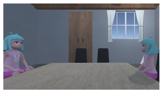 - Avatar: Facial presentation is the most important and complicated factor in this section. One way to achieve this is to update the avatar’s facial animation in real time by capturing the participants’ facial information in real time, such as the eye rotation, lip movement, etc. When a user wears a helmet-mounted display, it becomes difficult to capture the face data, and the action of the face needs to be controlled by the content of the participants’ speech []. As multiple participants join the conference room, each participant can see the virtual avatar of all other participants. When a user’s position status or body movements change, the new status should be synchronized with other users, for which a network module that synchronizes the status of all players is required.