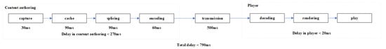 (6) + (7) + (8) The delay at the playback end was less than 20 ms for mainstream display devices. Network transmission delay was still the main factor causing end-to-end delay. After the above analysis, the following system (Figure 12) delay analysis composition diagram was obtained.