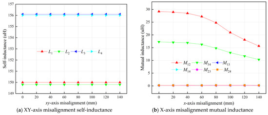 The DDQ pads and DD pads have been presented in [27,29], which are used to maintain stable power output against misalignment. Therefore, the DDQ magnetic coupler is adopted [2], as shown in Figure 4. All the self-inductances and the mutual inductances are measured along the X-, Y-, and Z-axis, as shown in Figure 5. The self-inductances almost remain constant when the misalignment occurs, as shown in Figure 5a, which illustrates that the pad misalignment cannot affect the self- inductance of the DDQ pad. In addition, only the main mutual inductances change apparently when the X-axis misalignment occurs, and the cross mutual inductances are small enough to be ignored in Figure 5b. Moreover, M12 and M34 have almost the same variation trend, which means that they have a linear trend. However, the M12, M34, M14, and M23 change dramatically in Figure 5c. In practice, when Y-axis misalignment occurs, auxiliary equipment can be used to adjust parameters such as the car reversing image or reversing radar. In Figure 5d, we can clearly find only the main mutual inductances change apparently when the Z-axis misalignment occurs, and the cross mutual inductances are also small enough to be neglected. However, the Z-axis misalignment rarely appeared in practical applications. Thus, this paper focuses on the analysis of X-axis misalignment.