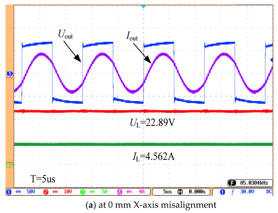 The experimental waveforms of the load at RL 10 Ω with different misalignments are shown in Figure 12. It is clear that the output current is 4.485 A, 4.665 A, and 4.383 A, respectively. In addition, the output current at RL = 10 Ω is slightly lower than the output current at RL = 5 Ω because the parasitic impedance results in a lower output under heavy load than under light load, which is consistent with theoretical analysis.