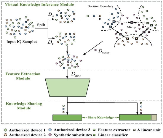 These synthetic substitutes frequently occupy the low-confidence regions of the feature space where real unauthorized classes located. As a result, they are similar to but different from the signal samples in the training set, and they meet the requirements proposed by []. In this section, these substitutes are used to augment the subset of the original training set , and their labels are forced to be a constant K + 1, where K is the number of authorized devices. In Algorithm 1, we provide the detailed pseudo-code of the virtual knowledge inference alogrithm.