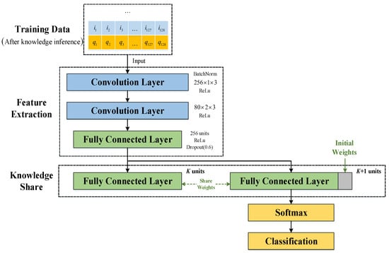 Knowledge distillation is a transfer learning method, which is first proposed by Hinton et al. in []. Its purpose is to transfer the knowledge learned in the teacher network (complex architecture but high accuracy) to the student network (compact architecture but easy to deploy) and help the student network converge faster. In brief, the knowledge distillation loss (KD loss) is an improved cross-entropy loss function (see Equation (7)), and it encourages the student network to produce similar responses to the teacher network by modeling the output of the original network when adapting to different tasks. Therefore, the KD loss is widely used to generate networks that approximate the original network but have different structures. After that, we note that Li et al. introduced KD loss in the related research of incremental learning [], which effectively alleviates the sequelae caused by the change of model architecture, that is, the updated model forgets the knowledge learned on the old class data. Inspired by this, our approach uses KD loss for knowledge sharing between the original closed-set model and the expanded model. This is proved to help our recognition model learn and correct decision boundaries between authorized and unauthorized devices in the open-set recognition task.