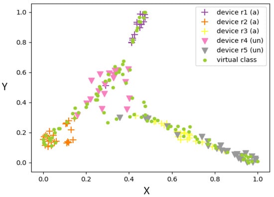 Most existing models are unable to solve the OSR problem since they lack the decision information of unauthorized devices. As a result, we propose the knowledge inference module to compensate for the lack of information. This module constructs virtual substitutes for unauthorized devices after making reasonable inference on the original training set. In the well-trained neural network, the feature representations of unauthorized classes are located in the low-confidence region near decision boundaries [], so that of constructed substitutes should also appear in these feature space. In this section, we use the feature extraction module to map the original signals of authorized devices, unauthorized devices and constructed virtual classes into latent features, and then apply the t-SNE algorithm [] to reduce the dimension of these features to two dimensions.