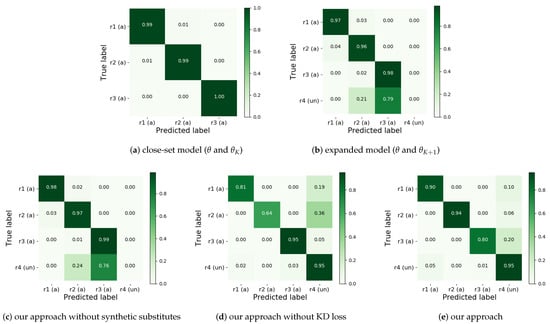 Two aspects of information are shown in the confusion matrix in Figure 5b,c. First, the addition of the KD loss function improves the model’s average accuracy for authorized devices (AKS) by 1%. Second, only relying on KD loss without synthetic substitutes, our model cannot identify unauthorized devices since lacking the decision information about these unauthorized classes. Furthermore, the results show in Figure 5c,e prove that the substitutes we constructed is useful, which improves recognition performance of the extended model by sharing the learned knowledge of the closed-set model. In addition, Figure 5d,e show the effect of adding KD loss on our approach’s recognition accuracy. It can be seen that the KD loss in our approach not only rarely affects the model’s ability to discover unauthorized devices, but also improves the accuracy of authorized devices by 8% (the average accuracy of authorized devices (AKS) increased from 80.00% to 88.00% as shown in Table 3). This indicates that the KD loss coordinates the identification and discovery capabilities of the model by correcting the decision boundary, and achieves an improvement in model recognition performance. Our approach is able to effectively discover unauthorized devices while improving the model forgetting on authorized ones. However, in contrast to our approach, most open-set models ignore the coordination between known and unknown classes, and they sacrifice the performance of known classes for the better performance of unknown classes.