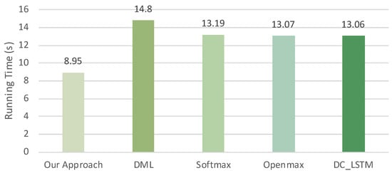 In addition, running time is an important factor to evaluate the complexity of OSR methods. The definition is the total time spent on one epoch model training and a corresponding test. We compared the running time spent by five OSR methods for the recognition model training on the ORACLE dataset. The running time results, as shown in Figure 6, confirmed that our approach outperforms other four OSR methods. Combined with the results shown in Table 4, our approach provides a significant performance advantage over than other four OSR methods. Therefore, we suggest that the OSR method proposed in this paper be used for wireless device recognition in open-set scenarios.