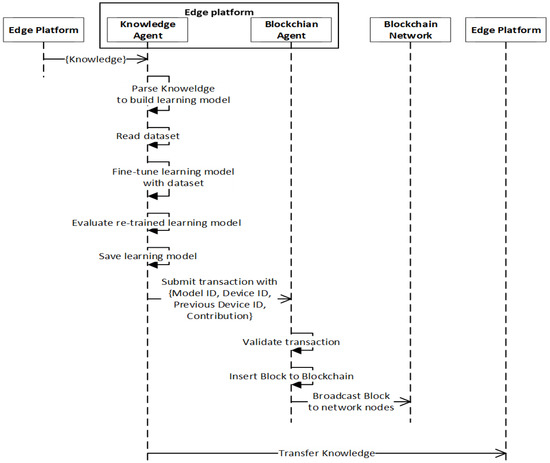 Figure 4 shows the knowledge transfer scenario in decentralized edge computing based on the blockchain network. First, the initial deep learning model is derived and deployed to edge computing. The model is delivered by the knowledge agent of an edge platform to another edge platform where the knowledge agent receives the model, and parses to tunable parameters to apply on fine-tuning with the local dataset. Once the model is updated by the training step, the agent saves the model for further access by web clients to implement prediction applications. Then, the information of transfer and contribution including identifiers of model, device and previous device, and performance metrics are submitted to smart contract of the blockchain agent. The agent validates the transaction and updates the distributed ledger over all participants of the blockchain network. Finally, the updated model is transferred to the next edge device. In the knowledge transfer process, and each contribution is achieved by the local data and computational support that improves the performance of knowledge.