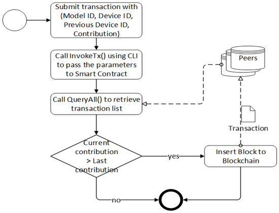 Figure 5 presents the transaction flow in the blockchain agent for each knowledge transfer. Once the model is updated, the transaction information is submitted to the blockchain agent, and the smart contract invokes the function to pass the transaction information as parameters. The function is named InvokeTx, which is accessed through the command line interface. Inside the InvokeTx function, the QueryAll function is invoked, which is used for retrieving the last inserted contribution to compare. If the new contribution is bigger than the last one, then the distributed ledger is updated to record the new transaction.