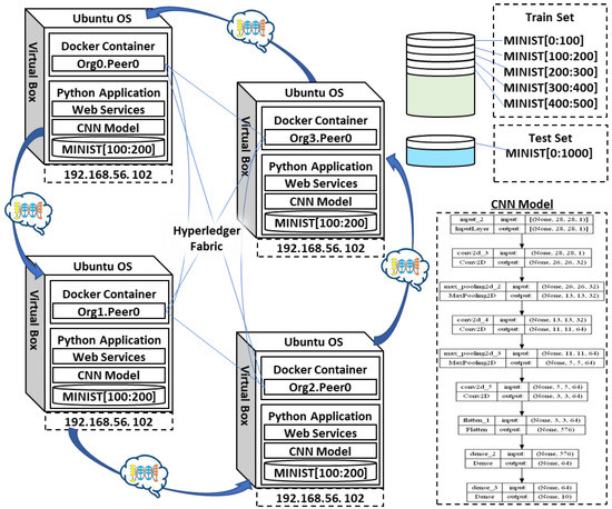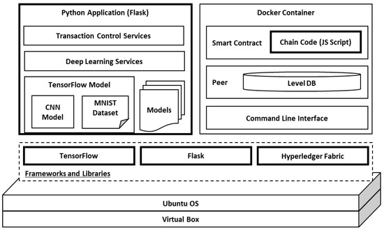As shown in Figure 6, the implementation is deployed in the Virtual Box platform that emulates the edge device for support computing and networking ability. The edge platform is operated on Ubuntu 22.04 Operating System (OS) where the frameworks and libraries are installed and configured. For enabling the deep learning approach, TensorFlow 2.10 framework is included for providing web services, Flask 2.2.2 framework is included, and for enabling blockchain, Hyperledger Fabric 2.7 is included. Hyperledger Fabric provides a modular architecture that is helpful to develop custom identity management for the permissioned blockchain network.