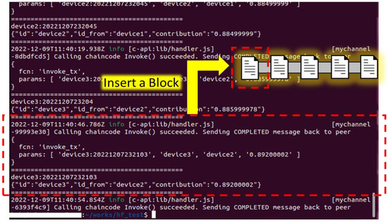 Figure 8 presents the implementation result of the transaction that is logged by the blockchain agent by triggering InvokeTx function of chain code. The passed parameters information depicts the model is delivered by an edge device with identifier device2 to this device with identifier device 3. The model identifier is device3:20221207232103 and the prediction accuracy is 89.2%, which is assigned as the contribution of the edge device.