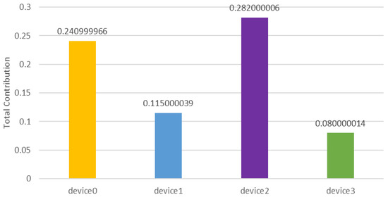Figure 11 presents the total contribution that is collected by summation of improvement for each edge device. The contributions are shared from the total improvement of the knowledge. Based on the result, device 2 improves the accuracy by 28.2% which contributes most, and device 3 improves the accuracy by 8% and provides the least contribution.