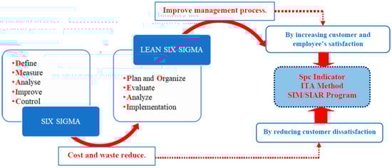 In our research, the element “key” from KPIs is considered the competitive advantage of the companies to have satisfied customers and implicitly satisfied employees. The “performance” element is given by all of the economic performance indicators mentioned above. The “indicator” is considered to be the moment before implementing ITA Methodology and Spc (considered M0) for each sector and the future corrections for more sectors. The conceptual framework is presented in Figure 1: the main concepts, Six Sigma and Lean Six Sigma, used as the reference for developing the method, the indicator, and the implementation program proposed by the authors, while the conceptual and methodological aspects are detailed in the following sections.