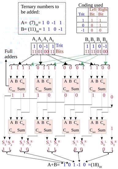 Two 4-trit numbers and are added with two levels of full adders in constant time (), irrespective of the wordlength. Each input trit is encoded as two bits, a left bit and a right bit, using the coding depicted in the table at the top right. After being processed using two stages of binary full-adders, each pair of sum bits ( and represent the left and right bits) are again decoded as a single trit to get the 5-trit sum A+B. Note that, after addition, both (Left bit, Right bit) = (0,1) and (Left bit, Right bit) = (1,0) are decoded as trit “0”.