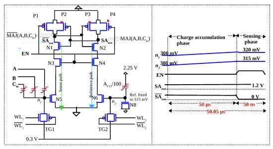 As stated, in this work, we pursued a circuit in which the FTJ is not switched to conserve the lifetime/endurance of the device. Figure 4 depicts the structure of an FTJ-based majority gate proposed by us. It consists of transistors N5 and N6 forming a differential pair and a sense amplifier (formed by transistors N1, N2, P1–P4). Transistors N3 and N4 connect these two circuits to form an FTJ-based majority gate. The inputs of the majority gate are applied as voltages to the three FTJs as on the left. All three FTJs are pre-programmed to polarization “UP” state (this is a one-time event performed during the fabrication of the majority gate). When the inputs are applied, depending on the inputs, the node gets charged to different voltages through the FTJs. In our circuit, logic “1” is 2.25 V, and logic “0” is 0 V. The FTJ on the right is used to charge the node to a fixed voltage and forms the reference during the sensing operation. The majority of the operation is achieved as a comparison operation. Node , which is the gate of N5, and node , which is the gate of N6, form the crucial nodes which decide the output. The operation of the proposed gate is achieved in two phases—the charge accumulation phase followed by the sensing phase. Just before the charge accumulation phase, nodes and are pre-charged to 0.3 V through transmission gates TG1 and TG2, respectively. Then the inputs of the majority gate are applied to the FTJs (2.25 V if logic “1” and 0 V is logic “0’) during the charge accumulation phase. During this phase, node is charged through three FTJs on the left, and similarly, node is charged through the FTJ on the right. If the input () to the majority gate is HIGH, there is a high potential (2.25−0.3 V ) across that FTJ, and a higher tunneling current is supplied to charge . Conversely, if the input is low, the tunneling current through that corresponding FTJ is negligible and does not affect significantly. Thus gets charged to a voltage corresponding to the inputs (). Simultaneously, node gets charged through an FTJ whose area is much smaller than the FTJs on the left ( is the area of the FTJ charging ). Hence it conducts a sub-pA current and charges to 315 mV, forming a stable reference (a different reference voltage can be achieved by changing the area of the FTJ charging ). The charge accumulation phase is allotted 50 s because the FTJ tunneling current is in pA, and 50 s are needed to charge the nodes to a reasonable voltage that can be sensed by the SA. After this, the sensing phase starts in which the Sense amplifier’s enable signal, EN, goes high. As shown in the waveforms, during the charge accumulation phase, the EN is low, and so transistors N3 and N4 are OFF, and there is no current flow either in the sense or reference path from to ground. When the EN goes high, transistors N3 and N4 are turned ON, and this causes transistors N5 and N6 to conduct. However, N5 and N6 do not conduct equal currents, but their currents are determined by the voltages at nodes and . If the potential at is higher than , N5 (sense path) conducts a higher current than N6 (reference path) and vice versa.