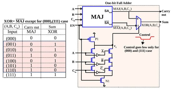 Having designed a majority gate using FTJs, we need to design a full adder to implement the circuit depicted in Figure 1. A full adder can be implemented using majority gates. In the literature, a full adder can be implemented in three logic levels (using 3-input majority gates [28]) or in two logic levels (using a 3-input majority gate followed by a 5-input majority gate [29]). However, both these methods incur latency and are not advantageous for our implementation since a single majority operation incurs ≈50 s. Therefore, we formulated a strategy to get the Sum (A⊕B⊕) from the majority gate output itself. As depicted in Figure 5, in six out of eight cases, the is equal to . Hence, we can derive the XOR (Sum of FA) from MAJ output if we can use a multiplexer to select between and . The “Control” signal of the multiplexer is high for the six cases and thus, = . For () = (000) and (111) case, the “Control” signal goes low, and = . The “Control” signal is generated from the inputs and , as depicted in Figure 5. Only for () = (000) or (111) there is a path between transistor P1 and N1. When is low, the capacitance at node is charged to . When goes high, transistor is ON, and it discharges node if a path exists to ground. For (000,111) cases, a path does exist, and node is discharged, and consequently, the “Control” signal goes low. Thus = . For the other six cases, there is no conducting path from to ground. Consequently, the “Control” signal remains HIGH and thus = . In this manner, we can get the Sum output in the same step as the majority operation (with a few picoseconds delay of the multiplexer), and this helps in reducing the latency of FA.