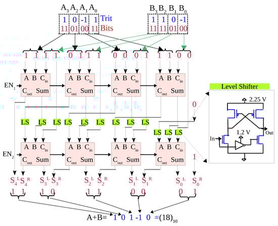 Simulated 4-trit ternary adder made of full adders: Since inputs to the FA require logic “1” to be 2.25V, Level Shifters (LS) are used to shift 1.2 V () to 2.25 V.
