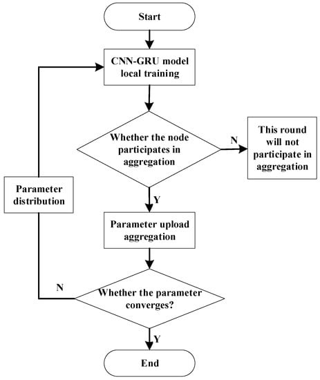 - Repeat steps 2 and 3 until the model converges with or reaches the specified maximum aggregation time, and end the training. At this point, the CNN–GRU model parameters with the best global effect will be obtained in the center.