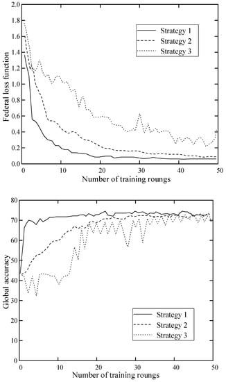 Considering that the current experimental environment cannot simulate the node timeout, the number of aggregated nodes in each round is a random number within the upper and lower limits. The nodes are randomly selected. The aggregation is mainly based on the loss function described in Formula (9) and the core aggregation formula described in Formula (12). The training dataset is divided into 100 pieces to simulate the situation when there are 100 training nodes in the FL model. The upper and lower limits of each round of the aggregation nodes are selected from the values shown in Table 3 to simulate the good, moderate, or poor status of the network or nodes in the actual scenario. The test results are shown in Figure 6.