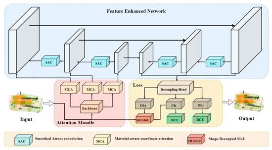 The block diagram of the proposed framework is depicted in Figure 2. The input origin image is fed into the CSP-DarkNet53 [] backbone for multi-scale feature extraction. The extracted multi-scale features are separately fed into the material-aware coordinate attention mechanism (MCA) for recalibration. In the MCA, the material information related to the contraband can be extracted and integrated more accurately by utilizing a spatial coordinate separation material perception module. Afterward, these features containing the aggregated material information are then fed into an improved path aggregation network (PAN) [], which is embedded in the multi-scale smoothed atrous convolution module (SAC), with the SAC levering the ability of the smoothed atrous convolution to increase the field of perception for further extraction and fusion of multi-scale object information. Finally, in the training stage, the contraband prediction results are output by the decoupling head. SD-SIoU is used in the bounding box loss calculation, which decouples the shape loss of the prediction box into the long-side and short-side shape loss. The specific details will be described in the following sections.