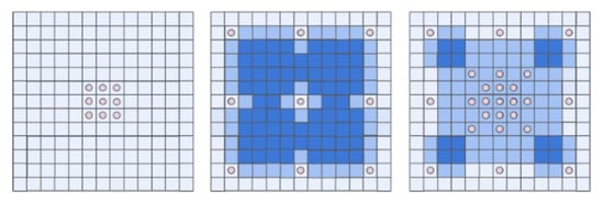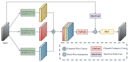 Compared to the traditional convolutional method, atrous convolution increases the receptive field of the convolution kernel while keeping the number of parameters unchanged []. However, atrous convolution faces a serious grid effect, weakening the proximate connections while gaining long-distance dependence. To address this problem, inspired by the smoothed atrous convolution [], a multi-scale parallel smoothed atrous convolution structure is designed, which is shown in Figure 3.