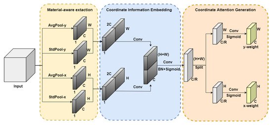 First, the input feature maps are put into the material-aware extraction module, which is constructed by average pooling and standard pooling in the width and height directions, to obtain four feature maps, respectively. Specifically, given the input X, two special two-dimensional convolution kernels, (H,1) and (1, W), are used to encode the input data, and four different pooling methods are used to obtain the horizontal and vertical coordinate encoding information. The output of the height, h, at the c-th channel can be presented as