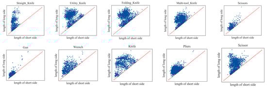 In the X-ray contraband images, the distribution of the long side and short side is always not equal, and the aspect weight of contraband varies greatly among different categories. Giving the same weight to the long side and short side will affect the optimization of the model for the contraband shape information. Figure 6 shows the scatter plot of the OPIXray dataset consisting of information on the long side and short side of different types of contraband.