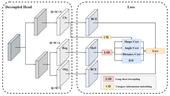 As shown in Figure 6, there is a significant difference between the long–short sides of the target box. To address this problem, we designed the long–short side decoupling module and the category information embedding module, based on the special structure of the YoloX decoupling head. The detailed structure is shown in Figure 7.