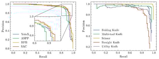 To better show the superiority of our proposed model, we plot the P-R curves for different receptive field modules, as shown in Figure 9. The P-R curve of our module is closer to the upper right position compared to the other models, which means that our SAC has a better performance.