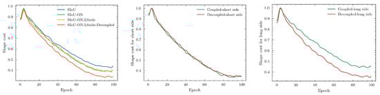 We recorded the shape loss curves and long–short loss curves of the SD-SIoU under different conditions. Since the loss data under different conditions varied widely and had small fluctuations, we normalized and denoised all the curves and indicated their validity by observing the decreasing trend of loss. The specific images are shown in the Figure 10.