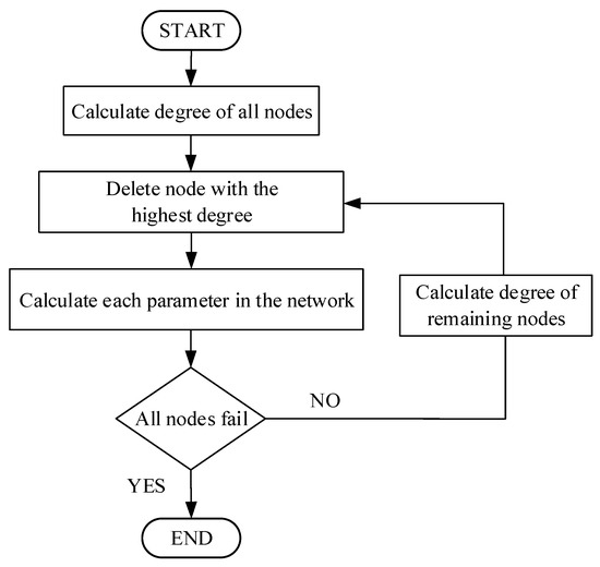 Based on the existing node-degree attack, this paper proposes a real-time attack mode, that is, first delete the node with the highest degree of a node, recalculate the node degree of the current network, and then delete the node with the highest degree of the current network, and cycle until all nodes are deleted. The attack process is shown in Figure 2. Compared with the static high-node attack strategy, this attack is more aggressive, leaving the network a shorter response time. It is more conducive to the study of network destructiveness.