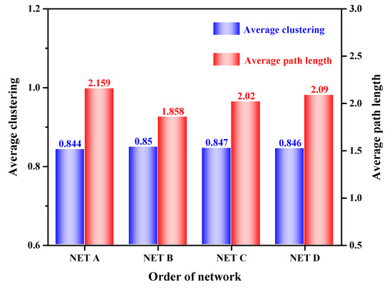 The main statistical characteristics of the four network models are shown in Table 1. To analyze the complex network characteristics more intuitively, two more important parameter indicators: the average clustering coefficient and the average path length are selected to draw bar graphs, as shown in Figure 3.